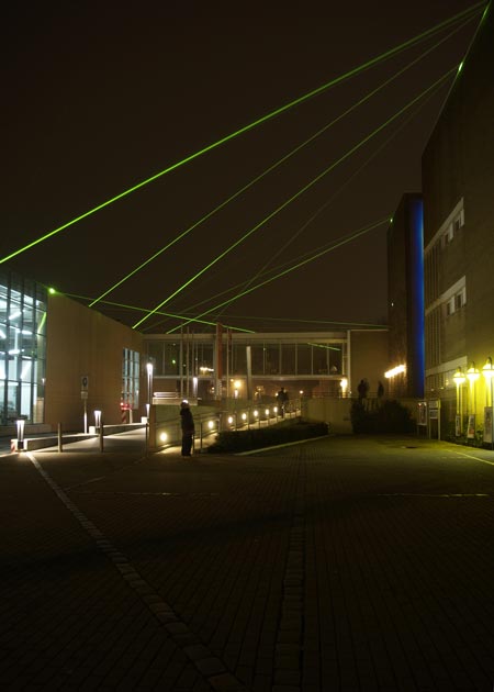 Laserlinien spannen sich zwischen den 25 m auseinander liegenden Gebäuden der Stadthalle und dem Museum Tuch u. Technik